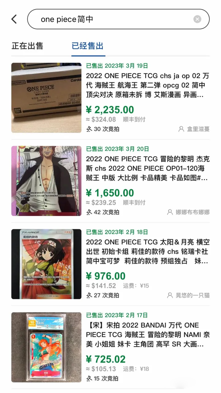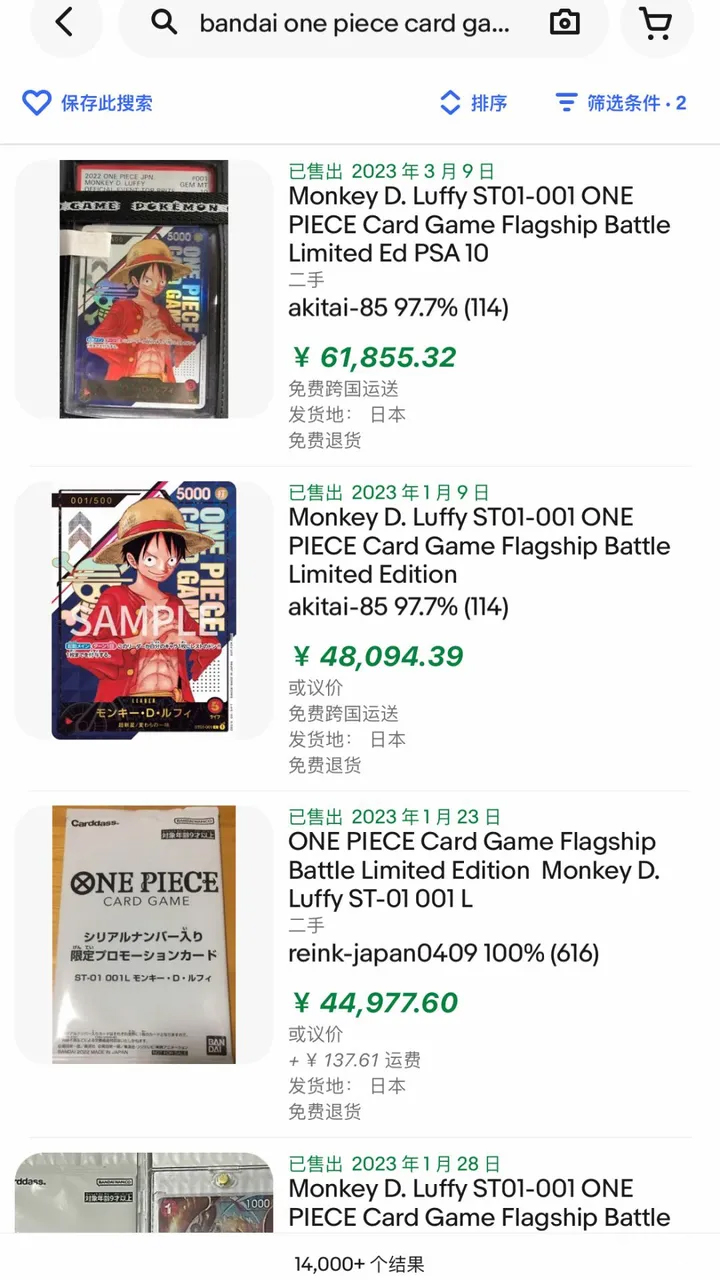 ▲《航海王卡牌对战》简中在eBay与卡淘的最高价格