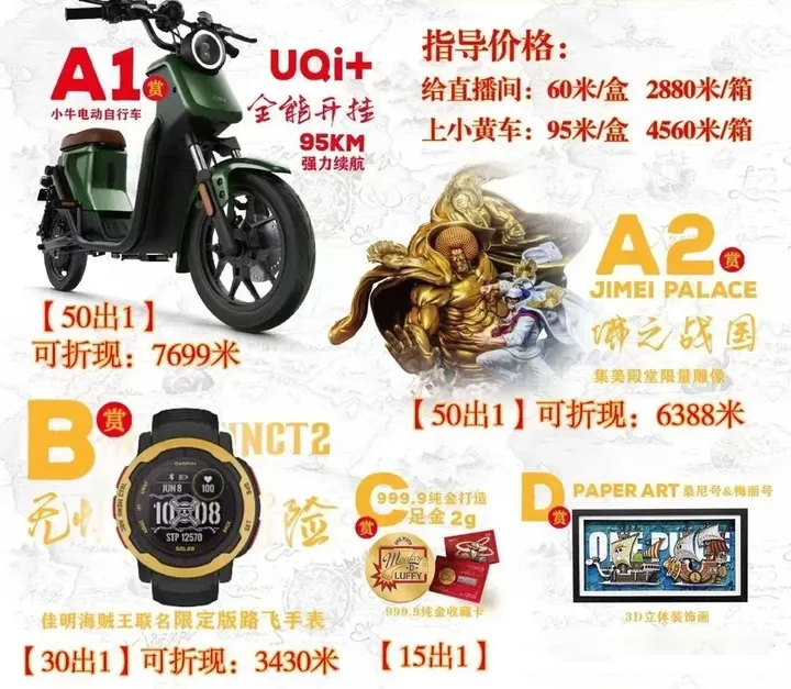 据统计,目前国内的盗版航海王卡牌出品方已有两位数之多,除了抓住尚无获得正版授权的国内出品方推出航海王卡牌的空缺以及用低价打开市场之外,抖音拆卡直播间中还有部分与正品卡牌价格相当甚至更高的盗版卡牌会以比如车、电子产品、手办、纯金物件等高价实体奖品吸引观众下单,而放大女性角色的身材优势大打擦边球的卡面设计更是随处可见。在面对以上诱惑时,一些海米与卡牌小白很容易会迷失在盗版卡中。